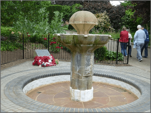 The Czech Memorial Fountain was erected nearby, in commemoration of one of the most daring undercover operations of the World War Two. It was planned at Harrington House (see article) opposite the Gardens and carried out by seven Czech Brigade parachutists who were billeted locally. The operation was code-named Anthropoid. The fountain, designed by local sculptor John French andmade from Hornton stone,was sponsored by the Association of Czech Legionnaires. It was unveiled by the Mayor, Miss Renee England, in October 1968. In 2018 the memorial was Listed Grade II.