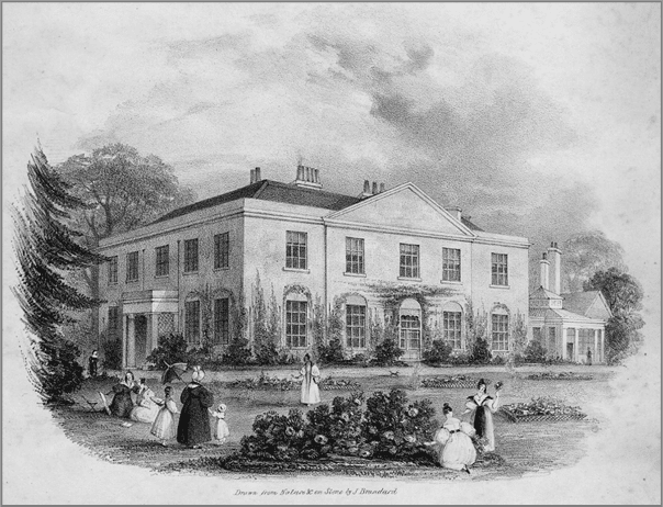 The family lived at Newbold Comyn Hall, their historical family seat, which lay to the east of the town centre of Leamington Spa and north of the river Leam. Newbold Comyn was separate from Leamington Priors and had been in the possession of the Willes family since Richard Willes purchased the estate in 1539. The first house built on the site remained until the eighteenth century when the Rev Edward Willes commissioned a new five-bay, two-storey house with pediment and low-pitched slate roof to replace it. It was, in fact, a relatively modern, small house for such an important family. The Rev. Willes died in 1820 and was succeeded by his son, also called Edward. Edward commissioned Henry Hakewill and a local architect, John Russell, to draw up plans for the addition of a library, verandah and conservatory to Newbold Comyn Hall. A view of the house in 1827 shows these additions with the house set in a landscape of mature trees and shrubberies.
