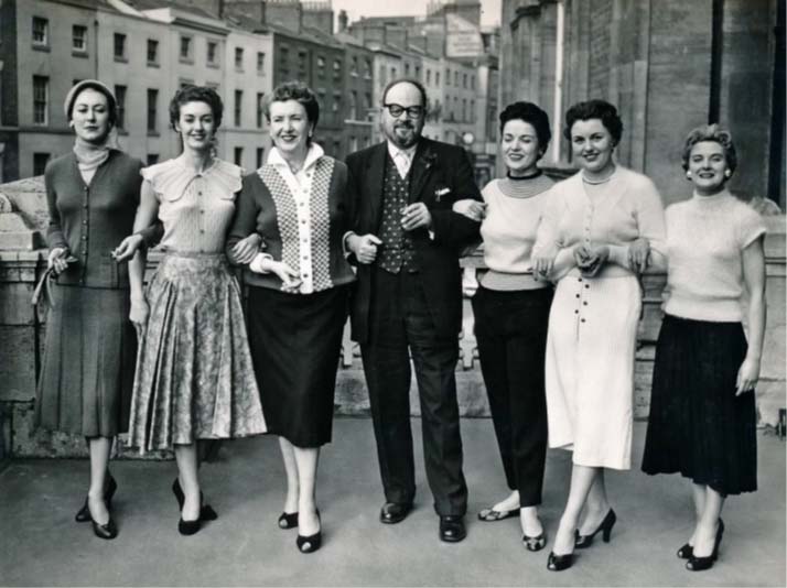 In 1956, Mr. James Norbury, the T.V. knitting expert and designer to Paton and Baldwin Ltd. was seen on the balcony of the Town Hall with six mannequins who modelled his latest designs.