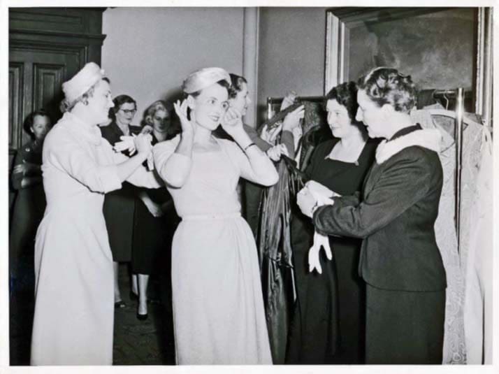 “Fifty years of fashion, from the early 1900’s and days of elegant long gowns in rich colours and fabrics to present day “spindle,” “cocoon,” and “trapeze,” lines, was the theme of a parade presented by Woodwards of Leamington, yesterday to mark the firm’s golden jubilee.