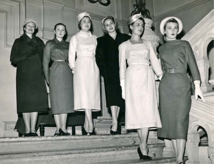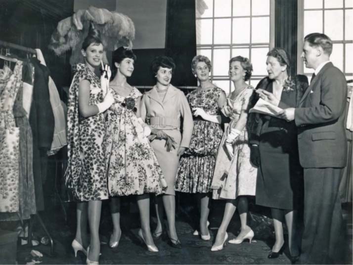 As the five graceful models left the room amidst applause, half a century was spanned in a second as another mannequin entered wearing a 16 guinea coat showing the Paris influence.