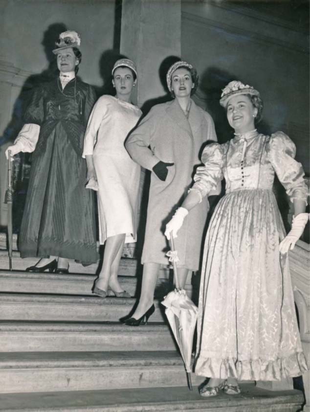 These styles contrast 1908 and 1958 at the golden jubilee fashion parade at Leamington Spa Town Hall in 1958.