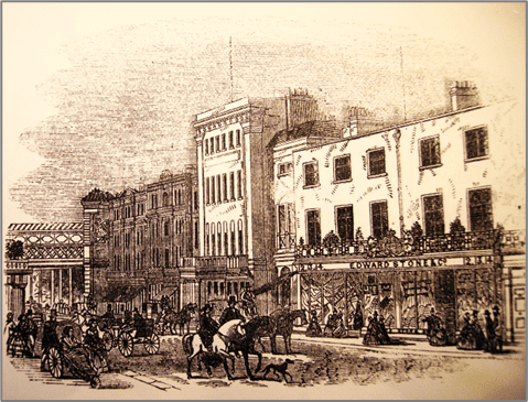 Competition for the business arrived in 1849 in the form of the Victorian Equestrian Centre at the end of Victoria Colonnade. By 1861 Nos 17 and 18 were used as Wackrill’s furniture warehouse. The Leamington public library at the corner of Church Walk and Bath Street, where Henry Elliston was appointed librarian in 1863, had outgrown these premises by 1864, so part of the Parthenon was leased to accommodate the overflow. In 1875 Bath Street was renumbered. Numbers 16, 17 and 18, the Parthenon, became 50, 52 and 54. In 1892 the shops, Nos 50 and 54, were occupied by J Jones, trunk maker, until at least 1896.