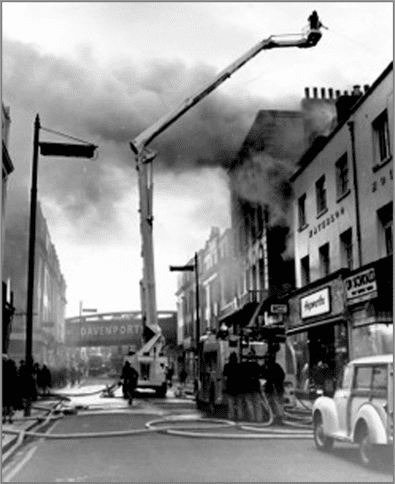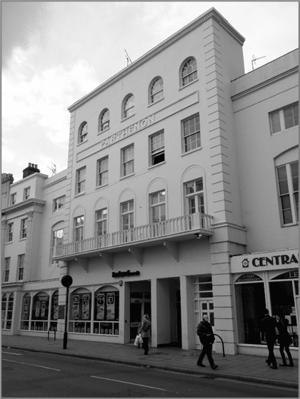 Even though Listed Grade II in 1953, the Assembly Rooms gradually deteriorated throughout the following decade and were partially destroyed by fire in January 1968. In 1970, the building was demolished and the front rebuilt in the style of the original but without the columns; it kept the name ‘Parthenon’ across the top front. The rear was rebuilt in modern style. A proposal for an indoor market was shelved in 1976 amid fears that it would be overshadowed by a new shopping development in Upper Parade. From 1975 to 1988 Bejam Stores occupied the ground floor, selling mainly frozen foods. The Parthenon is occupied by Iceland in 2018 and the street-level frontage is a modern glass shop front.