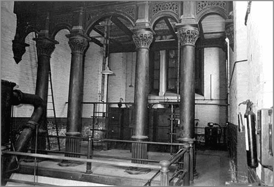 Eventually the works were completed and the whole plant commissioned to serve the increasing population of Leamington Spa. This growth prompted the need to increase the pumping station’s capacity to deal with sewage with the installation of a new horizontal pumping engine in an engine house erected at the side of the old engine house. In 1917 an engine manufactured by James Simpson & Co. of Pimlico in London was installed. It was around this time that the original Lancashire boilers were scrapped and replaced by two water tube boilers enabling the town’s refuse to be used as fuel. It is understood that the beam engines were scrapped in the 1920s. The cast iron columns which supported the beams remained in situ until the late 1970s.