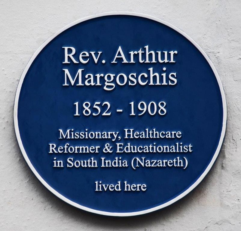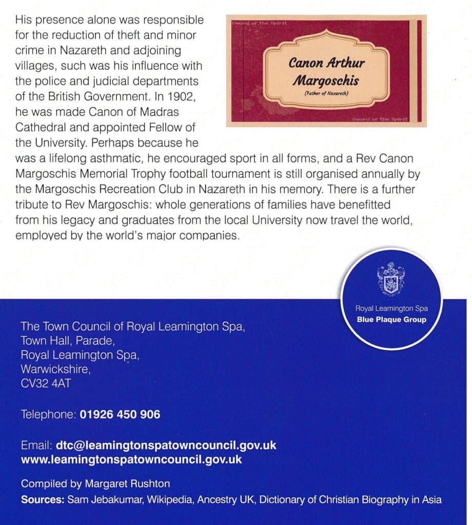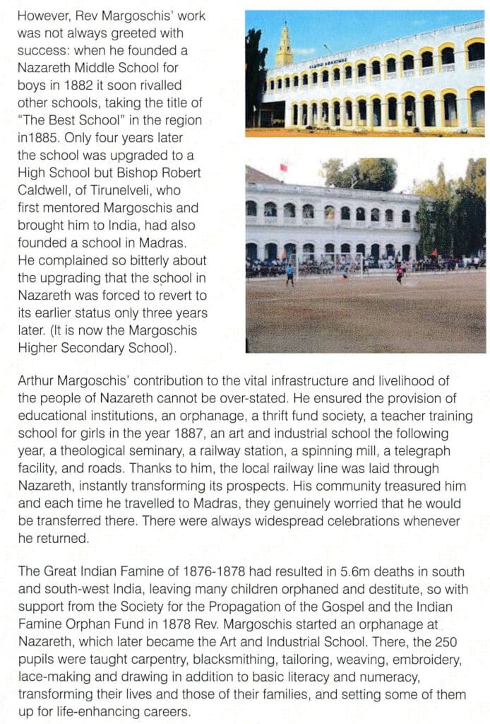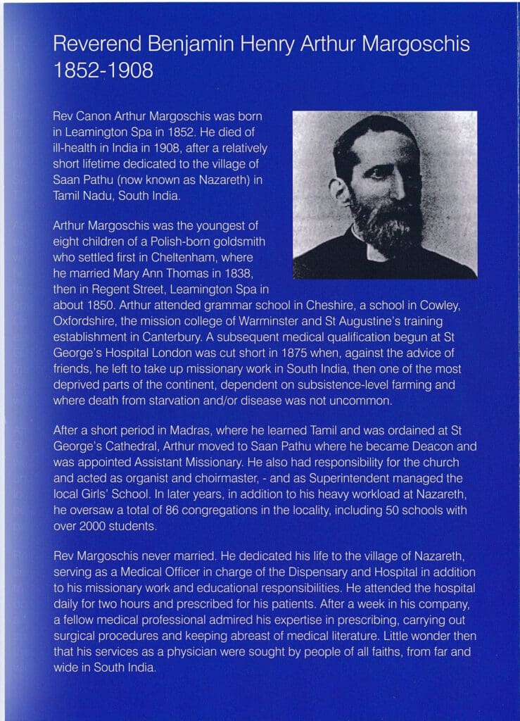 Rev Arthur Margoschis was born in Leamington Spa in 1852. He died of ill-health at a relatively young age in 1908 in India. He had dedicated his life to the people of the village of Saan Palhu (now known as Nazareth) in Tamil Nadu in South India.