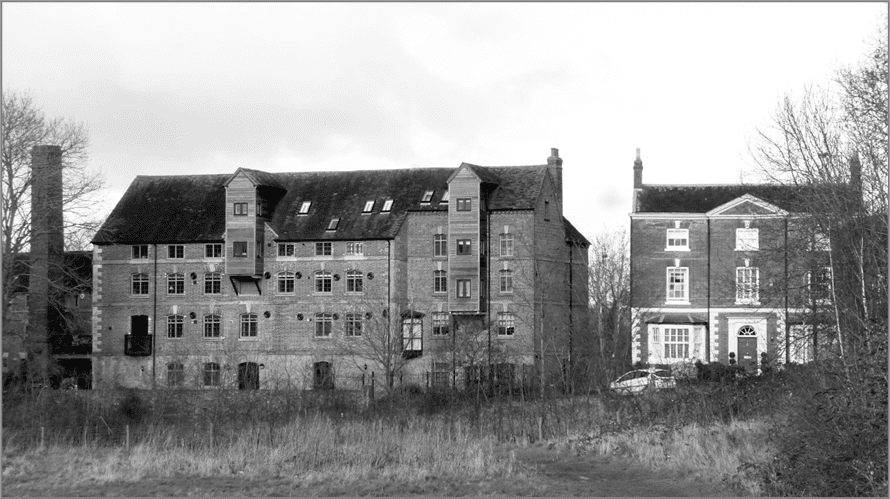 From 1835 the Kench family from Dunchurch were local millers, firstly at the Navigation Mills on the Emscote Road (that building becoming the Fleur de Lys pie factory and now the site of council flats). In 1889 Sheldon Kench leased the Rock Mill, using it as a gristmill to produce animal feed. After his son Leonard was killed on the Western Front in 1916, he sold both mills to George Rishworth from Yorkshire. Rishworth and his two sons operated the mills as ‘Kench and Son’, but in the 1950s found it difficult to recruit workers in the face of the motor industry’s relatively high wages. After both mills closed in 1961, Rock Mill seemed to be sinking into dereliction. However rising property prices in the 1990s, together with some imaginative thinking, created the conditions for an upscale housing development. Whatever the drawbacks, this solution has saved the fabric of a fascinating old building.