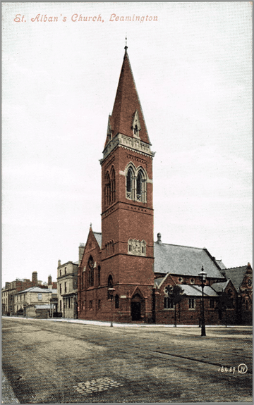 St Alban’s Church stood at the corner of Warwick Street and Portland Street. Its most distinguishing feature was a copper-coated spire. According to historian, T B Dudley, St Alban’s has had the most eventful history of all the Leamington churches. In 1861 the Rev. J Craig, vicar of All Saints erected a corrugated iron building in Priory Terrace. This corrugated iron chapel became known as the “New Opposition Church” or the “Vicar’s New Shop”.