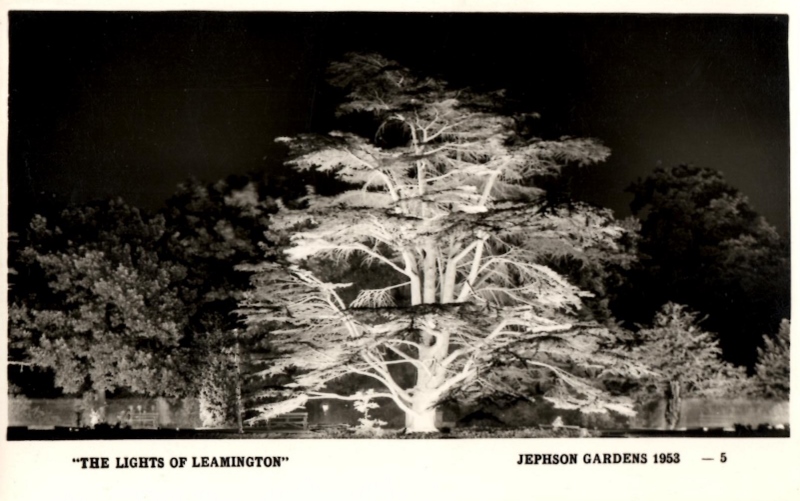 A brochure of the time promised live music, dancing, open-air ballet, variety shows in the Pavilion and fireworks. A headline from The Morning News in 1952 cited an astonishing 300,000 visitors who flocked to the town, over 20,000 of them on Saturday 28th August. Among the visitors one year was current Green Spaces Officer Jon Holmes, who came over from Kenilworth with his mother, to queue at the Lodge to get in. A postcard dated 1953 stirred fond memories for LHG member Frank James, who was an apprentice electrician at the time. He was paid a small allowance to use his own transport (- his bike!) to get to the Gardens to help install the lamps, but along with his colleagues, was not allowed to use the main entrance. Workmen had to use the small side gate between South Lodge and the river, away from public view. One of the jobs assigned to Frank was the installation of lighting in the magnificent cedar tree overlooking Willes Road, which he did by climbing a series of 6” nails hammered into the trunk, all the way to the top. Doubtless, the ‘ladder’ is still in place, – though it is highly unlikely that anyone would now be allowed to follow Frank’s example of 60 years ago, to find out.