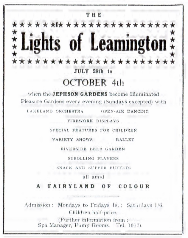 Following the Festival of Britain in 1951, for a whole decade, Royal Leamington Spa and Jephson Gardens became THE autumn venue for hundreds of people from all over Britain. Thousands of coloured electric lights transformed the Gardens into a wonderland for both children and adults. In August and September each year, the streets of the town were jammed by buses, coaches and cars as they dropped off their eager passengers.